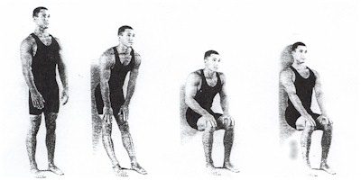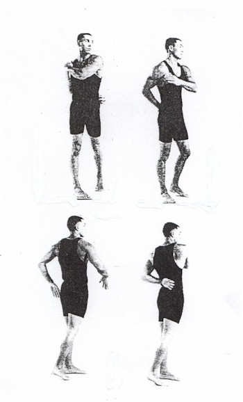 Warm-up ExercisesThe following group of exercises has been developed to open, relax, release tension, to strengthen various parts of the body, and to provide toning to different parts of your body. If you are overweight, in poor physical condition, or experiencing serious illness, this group of exercises is an excellent to help you begin your journey towards physical fitness. I suggest you do these warm-up exercises prior to the Five Rites if you are overweight or have not exercised in a long time. Begin this group of exercises by doing 2 of each exercise and then gradually increase the repetition until you are able to do 10 of each warm-up exercise. Warm-Up Exercise #1